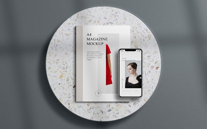 A photorealistic free magazine mockup scene with shadow overlay effect to present your magazine cover design in a unique way. the mockup includes A4 size magazine and Iphone x, Two round base and two shadow overlay includes.